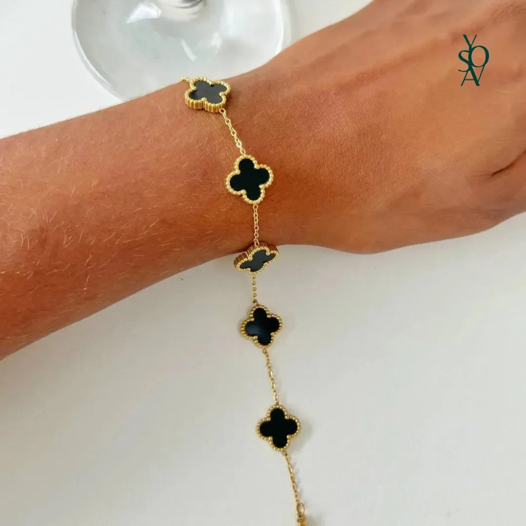 Enhance your elegance with this exquisite bracelet, crafted with intricate detail. Featuring a captivating pattern of black clover motifs set against a luxurious gold link chain, it reflects a timeless sophistication. Perfect for both everyday wear and special occasions, this accessory adds a touch of refinement and style to any wardrobe.