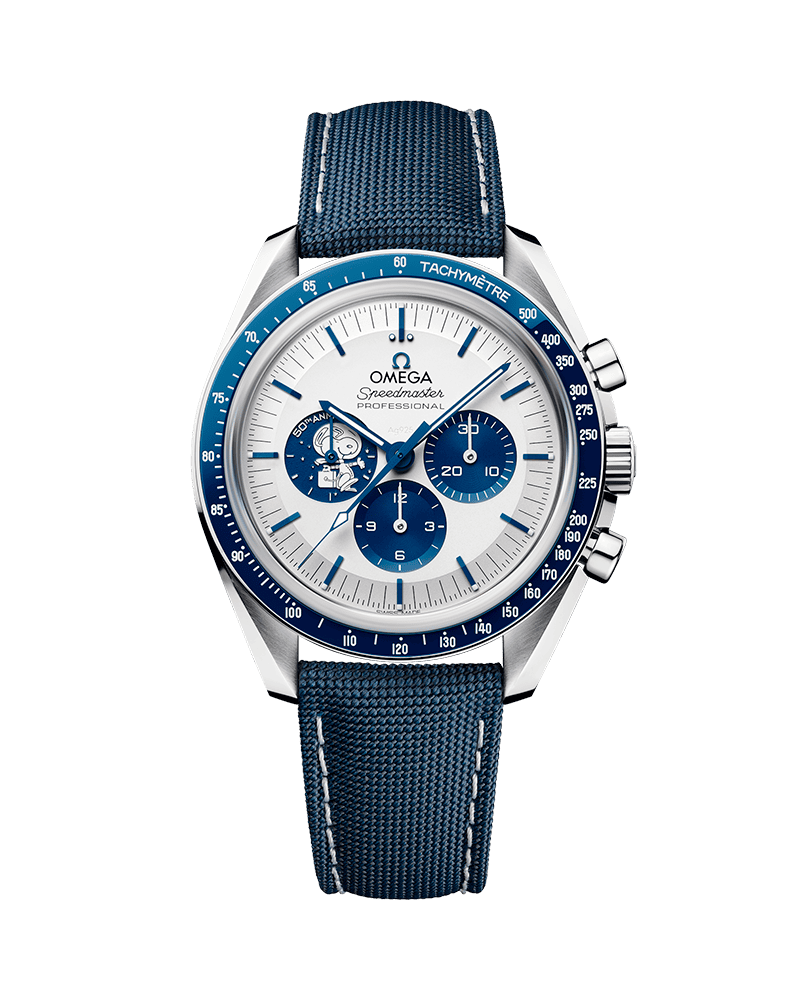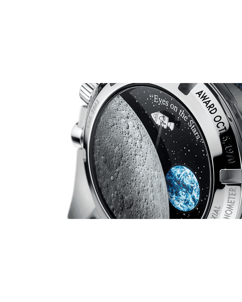 On the caseback, Snoopy appears on the Service Module (CSM) as a magic hand. When the chronograph is activated, it travels towards the Moon, decorated on the sapphire crystal. An Earth disc also rotates once per minute, synchronized with the small seconds hand.