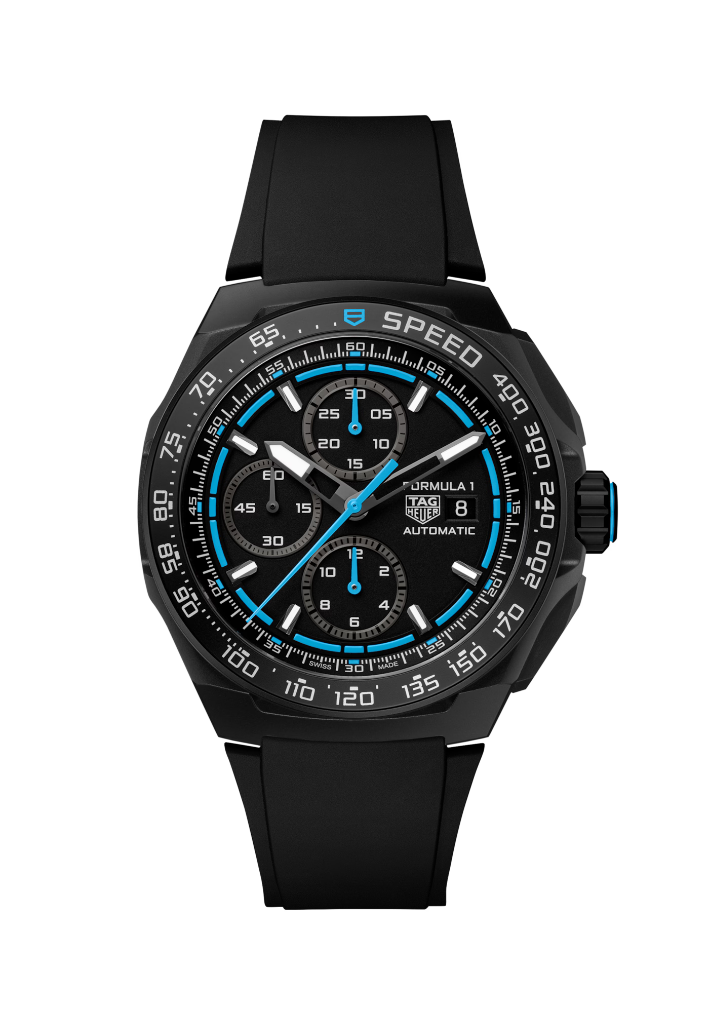 Designed for the daring, the TAG Heuer Formula 1 Chronograph in 44mm brings the spirit of racing to the wrist. The titanium grade 2 case, red accents, and rugged rubber strap create a timepiece ready for any challenge.